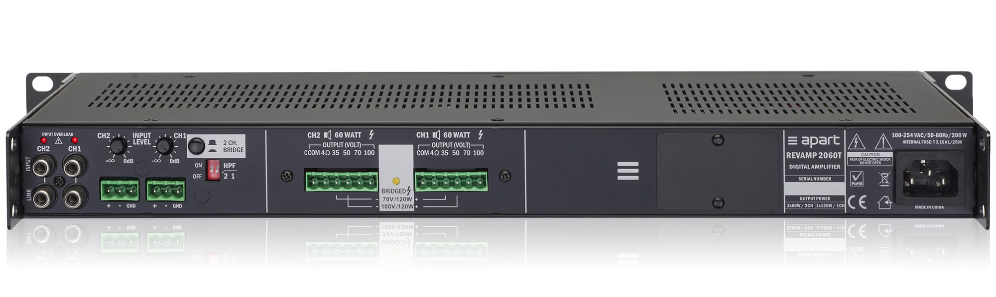 Универсальный REVAMP2060T — это профессиональный двухканальный цифровой усилитель мощности с выходной мощностью 2x60 Вт при 100 вольтах или 4 Ом, который легко может быть преобразован в мощный одноканальный усилитель мощностью 120 Вт при 100 вольтах или 8 Ом.