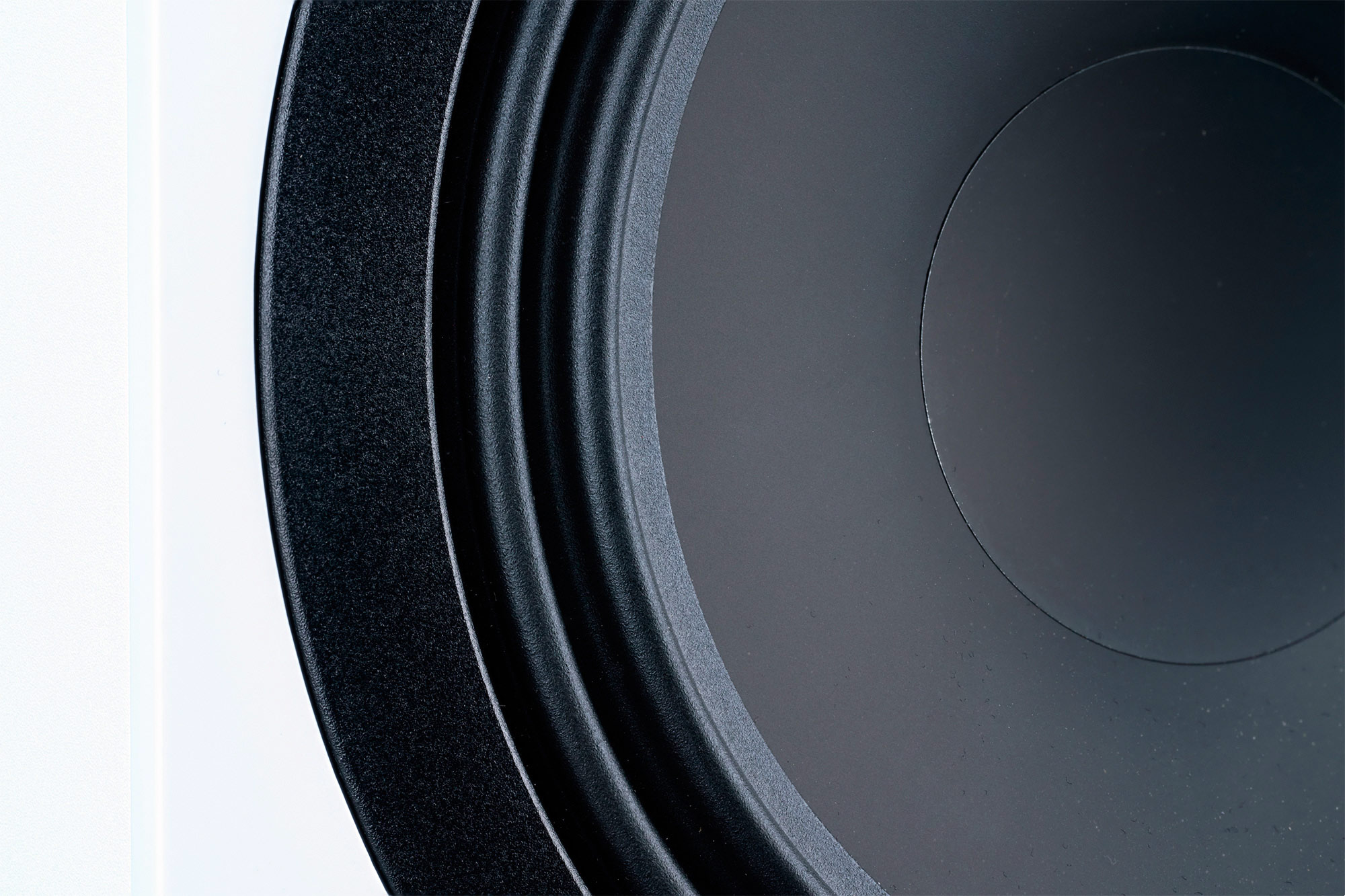 - Низкочастотный динамик (154 мм) изготовлен из алюминиево-титанового сплава чёрного цвета на волнообразном подвесе