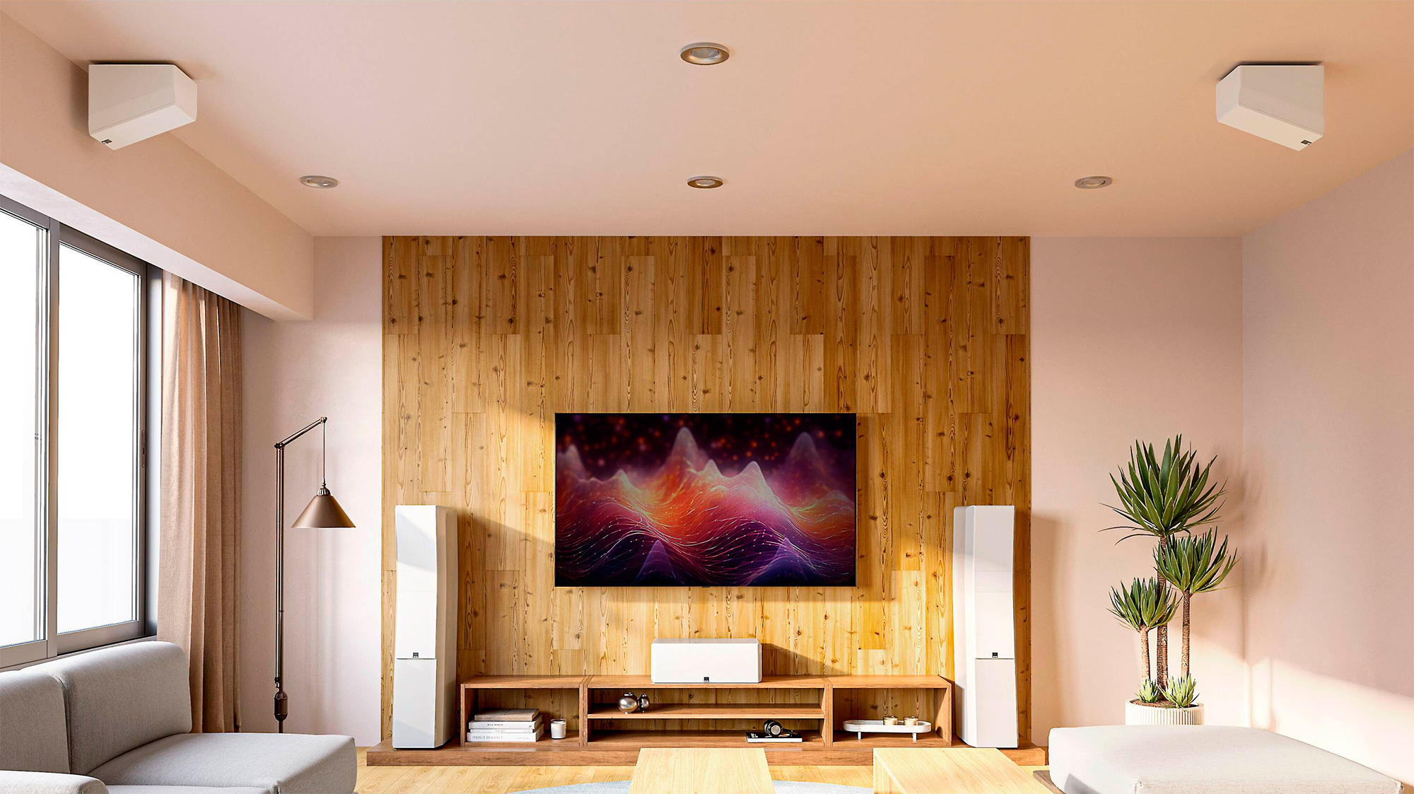 - Акустически центрированная архитектура ориентирует массивы среднечастотных и низкочастотных динамиков в симметричном относительно твитера положении, обеспечивая излучение низких, средних и высоких частот из одной эффективной точки в пространстве, создавая целостную, интегрированную и точную акустическую картину.